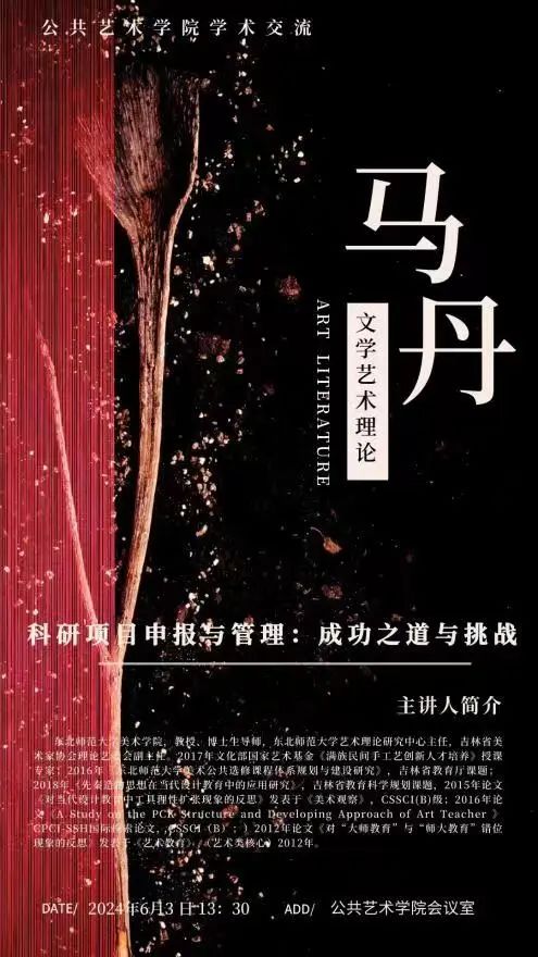 主讲人简介:马丹,东北师范大学美术公司,教授、博士生导师,东北师范大学艺术理论研究中心主任,清华大学美术公司访问学者,意大利威尼斯建筑大学访问学者,教育部全国普通高校师范认证专家,吉林省教育厅“十三五”规划项目评审专家,吉林省美术家协会理论艺委会副主任。
