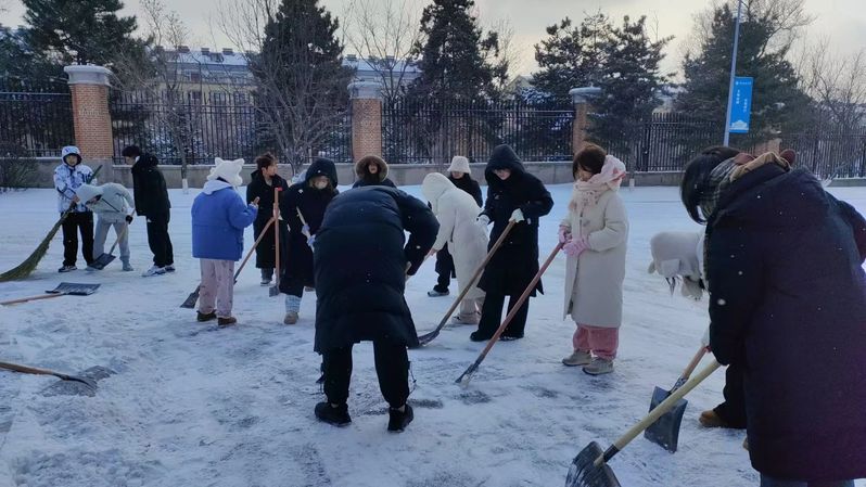 “六出飞花入户时,坐看青竹变琼枝。”一场纷纷扬扬的大雪,将校园装点成了银装素裹的童话世界。然而,美景之下,校园道路被积雪覆盖,也给师生们的出行带来了不便。于是,一场校园扫雪行动在皑皑白雪中火热展开。